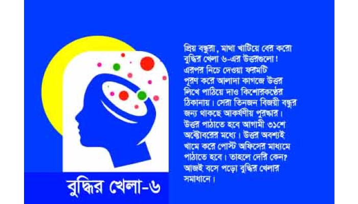 প্রিয় বন্ধুরা, মাথা খাটিয়ে বের করো বুদ্ধির খেলা ৬-এর উত্তরগুলো! এরপর নিচে দেওয়া ফরমটি পূরণ করে আলাদা কাগজে উত্তর লিখে পাঠিয়ে দাও কিশোরকণ্ঠের ঠিকানায়। সেরা তিনজন বিজয়ী বন্ধুর জন্য থাকছে আকর্ষণীয় পুরস্কার। উত্তর পাঠাতে হবে আগামী ৩১শে অক্টোবরের মধ্যে। উত্তর অবশ্যই খামে করে পোস্ট অফিসের মাধ্যমে পাঠাতে হবে। তাহলে দেরি কেন? আজই বসে পড়ো বুদ্ধির খেলার সমাধানে।