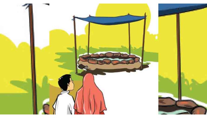 : কয়েকটা বড়ো ছোট পাথর জোগাড় করে, ঐ যে কাঁটা ঝোপটার সাথে ঢিবির মতো দেখছেন, সেখানে। পাশে একটা বড়ো গর্ত করে ময়লা যাওয়ার অবস্থা রেখেছি। নূর চাচার বাড়ি বানানোর সময় একটা বড়ো সিমেন্টের শ্লট আমরা চেয়ে নিয়েছিলাম। সেটা নিয়ে গর্তটা ঢাকার সময়, চাচা এসে দেখে বললেন, আগে বললে আমি তোমাদের আরো সহযোগিতা করতে পারতাম। অসুবিধা নেই। মাটির তলা দিয়ে পানির বন্দোবস্ত কীভাবে করতে পারি দেখি। এ কথা বলার পর, চাচা আমাদের ঐ টয়লেটের আশপাশে আরো দুটো টয়লেট, পানির রিজার্ভ ট্যাংক বানিয়ে দিয়ে, টয়লেটের ভেতর পাইপ লাইন টেনে, পানির বন্দোবস্ত করে দিয়েছেন, মাটির ঢিবির আড়ালে একটা মোটর এমনভাবে রেখেছেন, যা কেউ সহজে দেখতে পাবে না। বড়ো ব্যাটারি রাখা আছে মোটর চালানোর জন্য। সোলার প্যানেলও রাখা আছে।